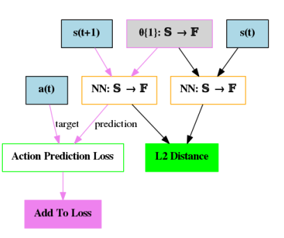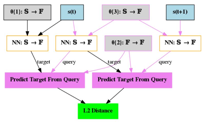 Let us look at the second term in \(\mathcal{L}_b\) given by \(\|b_{\theta_2}(fr_{\theta_3}(s_{t+1}))-fr_{\theta_3}(s_t)\|_2\). We apply a forward and then a backward transformation to the random embedding of state \(s_{t+1}\), so we should end up with just the random embedding of state \(s_{t+1}\). We then apply \(fr_{\theta_3}\) to state \(s_t\) and end up with the forwarded random embedding of state \(s_t\), which should equal the random embedding of \(s_{t+1}\).