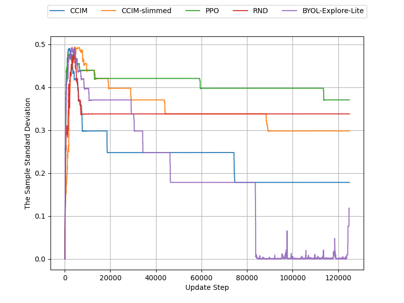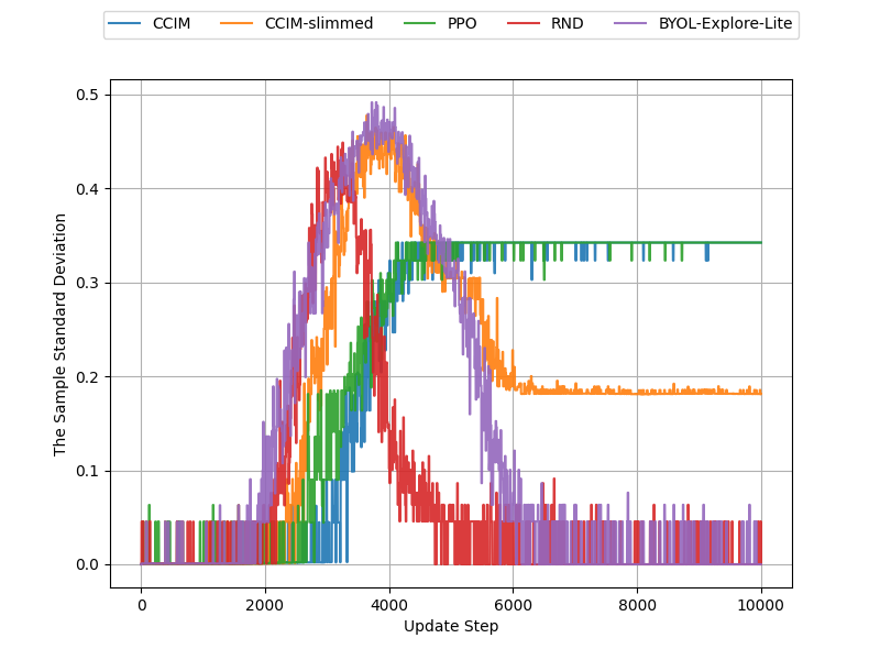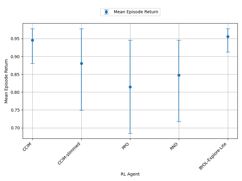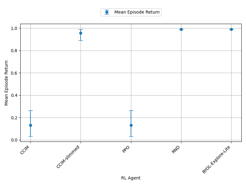 We start with the deep sea environment. The left of Figure 11 shows the sample standard deviation during training. We only show it for the first 10,000 steps because after that we notice the graphs plateau. We see that RND and BYOL-Explore Lite produce the most consistent agents in the deep sea environment. And CCIM-slimmed produces more consistent agents than CCIM and PPO. Looking at the right of Figure 11 we can see the mean episode return across the 30 seeds with the 95% confidence intervals. RND, BYOL-Explore, and CCIM-slimmed all perform better than PPO. However, CCIM does performs roughly the same as PPO at the end of training. From our experiments we also noticed that intrinsic rewards produced by CCIM increase and then plateau. The CCIM random and forward network’s loss continued to increase during training as well.