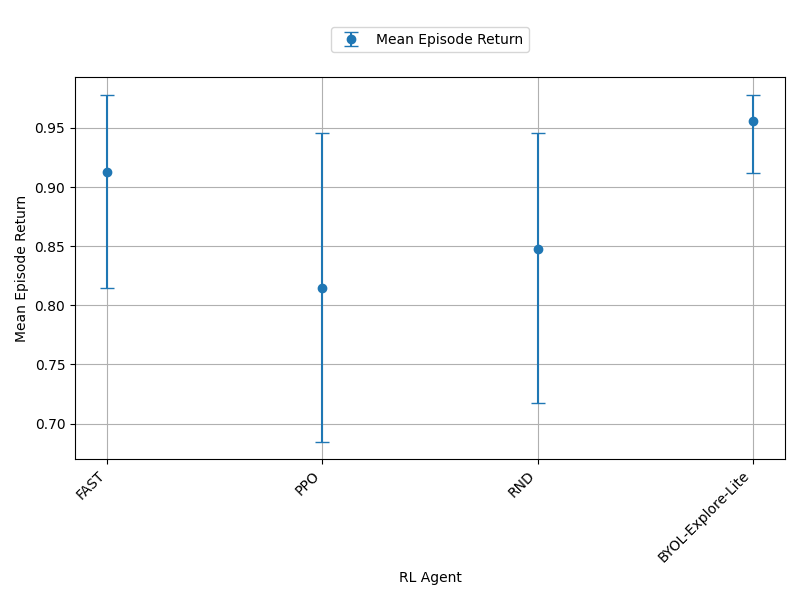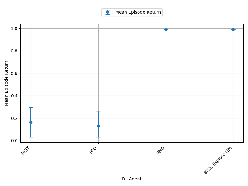 This is different from RND and BYOL-Explore Lite. The intrinsic reward is not given by a predictive error or the loss function of one of the networks in the program. We understood the above formula as the L2 difference between the logits of the current state and the next state. The agent is then rewarded if the next state’s logits is different from the current state. Importantly, the agent isn’t rewarded for taking a different action in the next state. Alet et al. pointed out that if the policy-mimicking network has a uniform distribution over the action space in all states, the agent will receive an intrinsic reward of zero. Therefore, in environments where the action probability distributions outputted by the policy-mimicking network vary across states, we expect this algorithm to generate intrinsic rewards. We hypothesize that this algorithm may not perform well in environments where the optimal policy requires the agent to visit states with very similar action probability distributions. While the agent explores by going to different states, ideally, we wish for the intrinsic rewards to decrease as the agent explores. Looking at the output of FAST it is not clear to use how the intrinsic reward decreases, and we expect that this could cause issues.