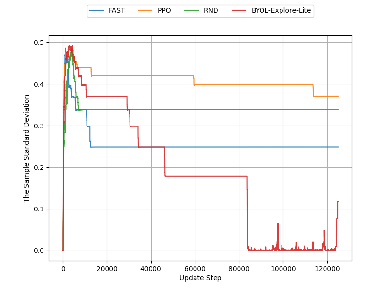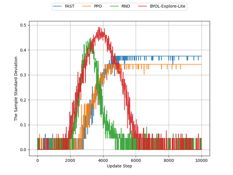 Let us now turn our attention to how FAST performed. We began with the deep sea environment. In Figure 15 we plot the sample deviation for the first 10,000 steps, as we observe no significant difference beyond this point. The left side of Figure 15 indicates that PPO and our curiosity-driven baselines produces more consistent agents than FAST as they exhibit a lower sample standard deviation.