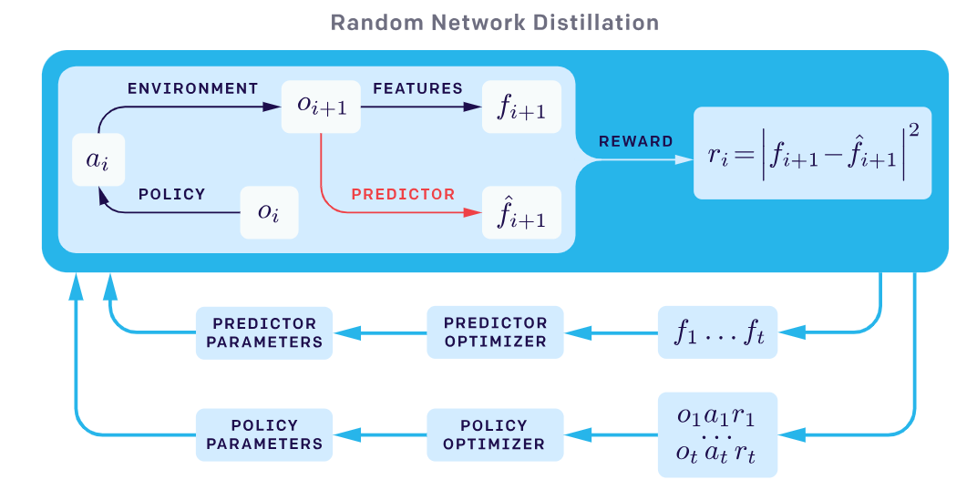 where \(\hat{f}_t\) is the output of the predictor network. The formula above also serves as the loss function of the predictor network. We normalise \(r_i\) by dividing it by the running estimate of the standard deviations of the intrinsic returns. We do this because the intrinsic rewards can be very different in various environments. Normalising the intrinsic rewards make it easier to pick hyperparameters that work across a wide range of environments. As the agent explores more the predictor network will get better and the intrinsic rewards will decrease. The key idea in RND is that the predictor network is trying to predict the output of a network that is deterministic, the target network. The figure below illustrates the process of RND.
