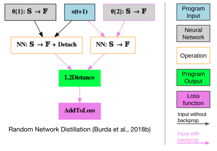 The output node is the green rectangle and is the L2 distance between the output of predictor network and the target network. This is the loss function described in the RND section. Note that the \(\theta\){2} rectangle has a pink border and a pink arrow, this indicates that it can be updated via back-propagation. While the \(\theta\){1} rectangle has black border and a black arrow indicating the parameters are not updated via back-propagation. Also note that the functional module that makes use of those parameters has the word “Detach” indicating the gradient information is not flowing back. Recall that \(\theta\){1} represents the parameters of the target network, which remain fixed, and \(\theta\){2} represents the parameters of the predictor network, which are updated during training.