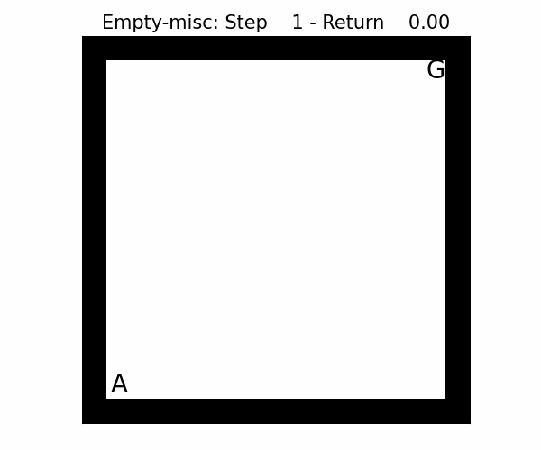 The empty grid-world is a very simple environment. As mentioned earlier the agent’s task is to reach the goal position. The size is \(16\times 16\) and the maximum number of steps is 1024. In our implementation the agent starts at the bottom left corner and has to reach the top right corner. The reward that agent recieves if it finds the goal is 1 - 0.9 * (step_count / max_steps). The gif shows a RL agent exploring the environment to reach the goal.