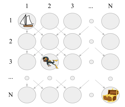The agent starts at the top left corner and its goal is to reach the bottom right corner. At each time step the agent descends one row. The agent can either go left or right. There’s a small penalty of going right which is \(−0.01/N\) while going left just gives a reward of zero. The agent receives a reward of 1 if it finds the treasure at the bottom right corner. The max number of steps in the environment is \(N\). Therefore, the optimal policy is to go right at every time step ignoring the greedy action. In our experiments we set \(N=10\).