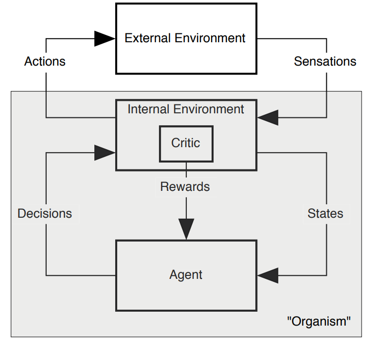 From the figure we can see that the agent observes a state and then takes action. The agent can then decide on its next action based on the next state it observes and the rewards it receives from the critic in the environment. The critic decides on what reward the agent receives at every time-step by evaluating its behaviour.