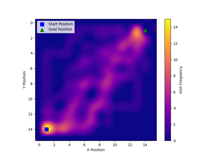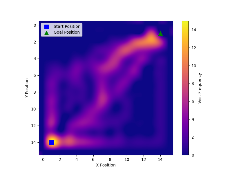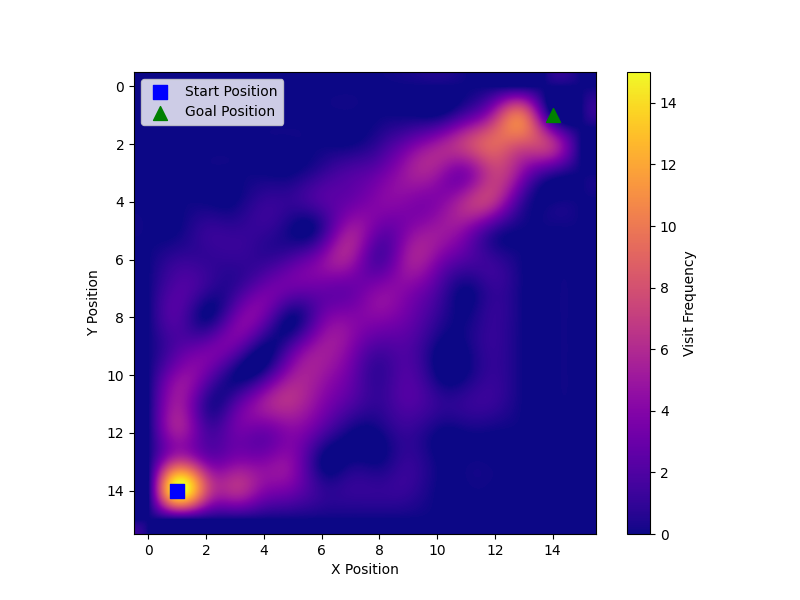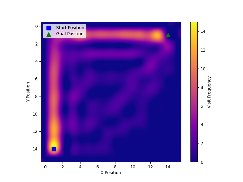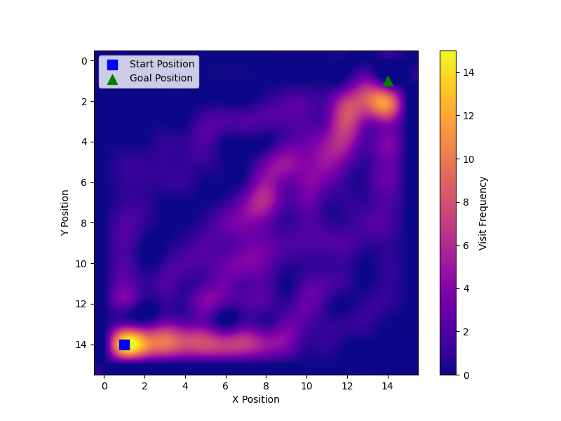 We once again plot the heatmap of FAST and compare it to PPO’s heatmap using the best 15 seeds. When comparing Figure 17 (left) with both Figure 17 (right) and Figure 13, we observe that FAST covered more of the grid-world than PPO, BYOL-Explore Lite, and RND.