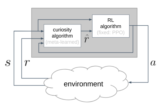 In the above figure we can see that the curiosity algorithm, \(\mathcal{C}\), takes in the state and reward from the environment and then feeds proxy reward \(\hat{r}\) to the RL agent. The RL algorithm used is a fully-specified algorithm, i.e., all its hyperparameters are specified. There were two stages in the authors search because the module \(\mathcal{C}\) is made of two components. The first component, \(\mathcal{I}\), calculates the intrinsic reward given the current state, next state and the action taken. The second component, \(\chi\), then takes the extrinsic reward, the intrinsic reward and the current normalised time step to combine them and output \(\hat{r}\).