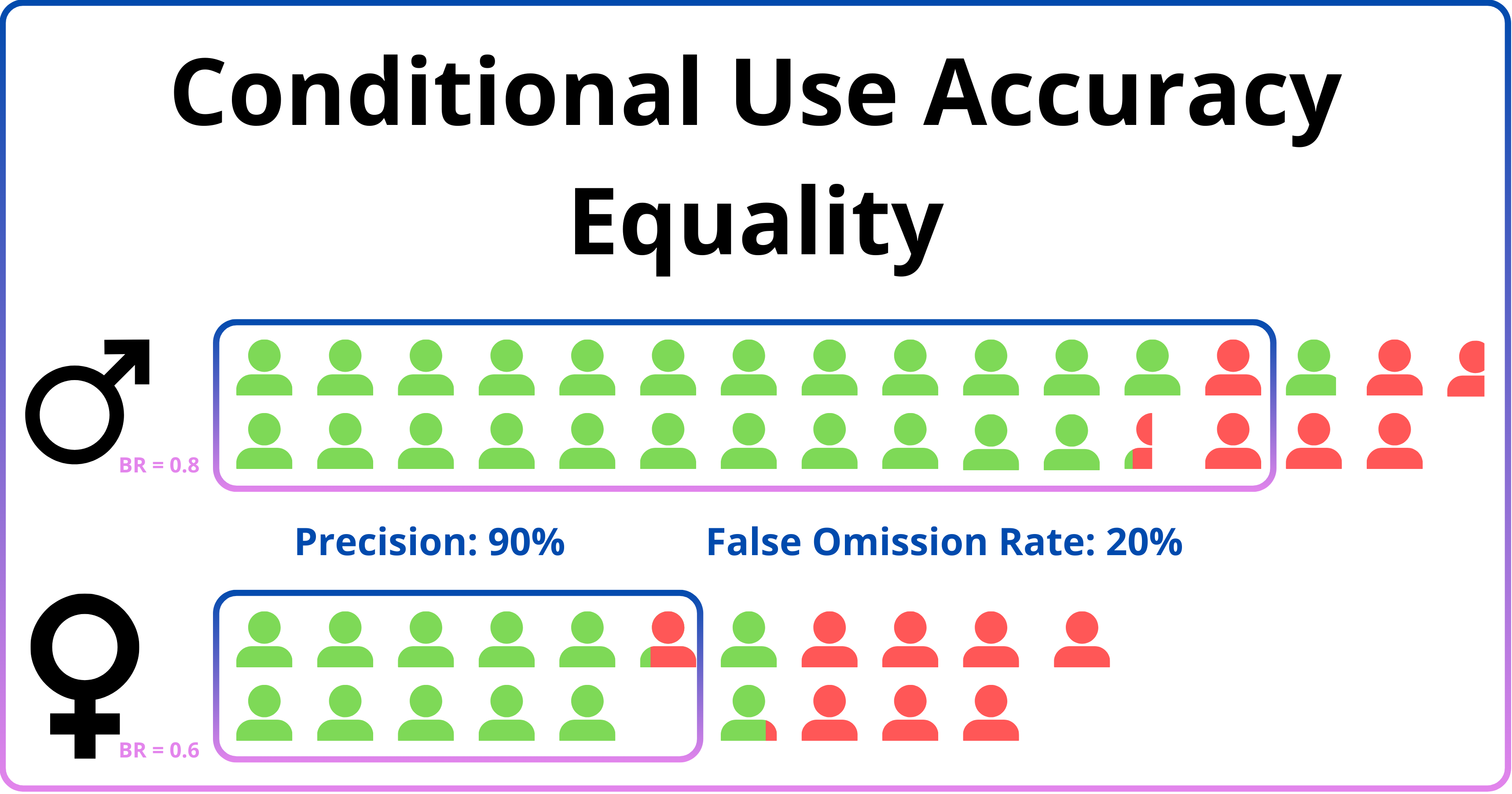 | Conditional use accuracy equality | \(P(Y=1\vert A=1, d=y) = P(D=1 \vert A=0, D=y)\) | \(Y \bot A \vert D\) |