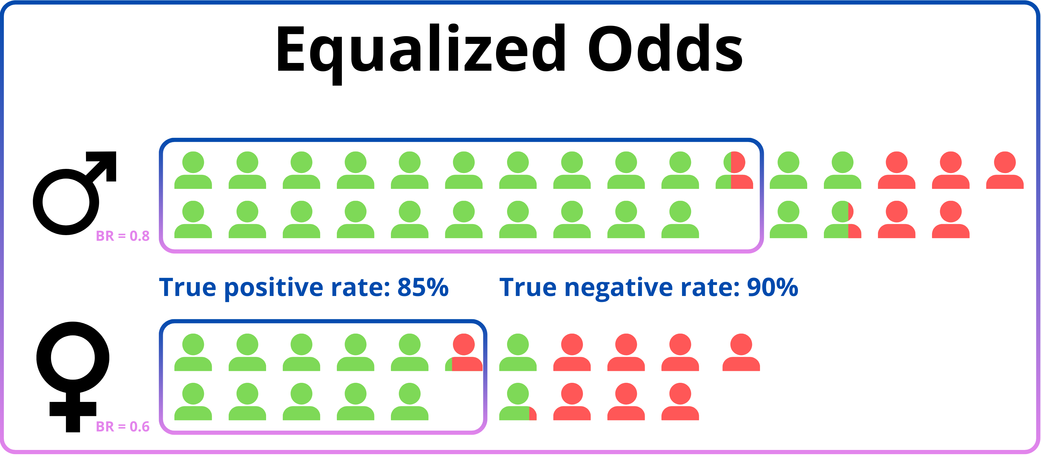 | Equalized odds | \(P(D=1 \vert A=1, Y=y) = P(D=1 \vert A=0, Y=y)\) | \(D \bot A \vert Y\) |
