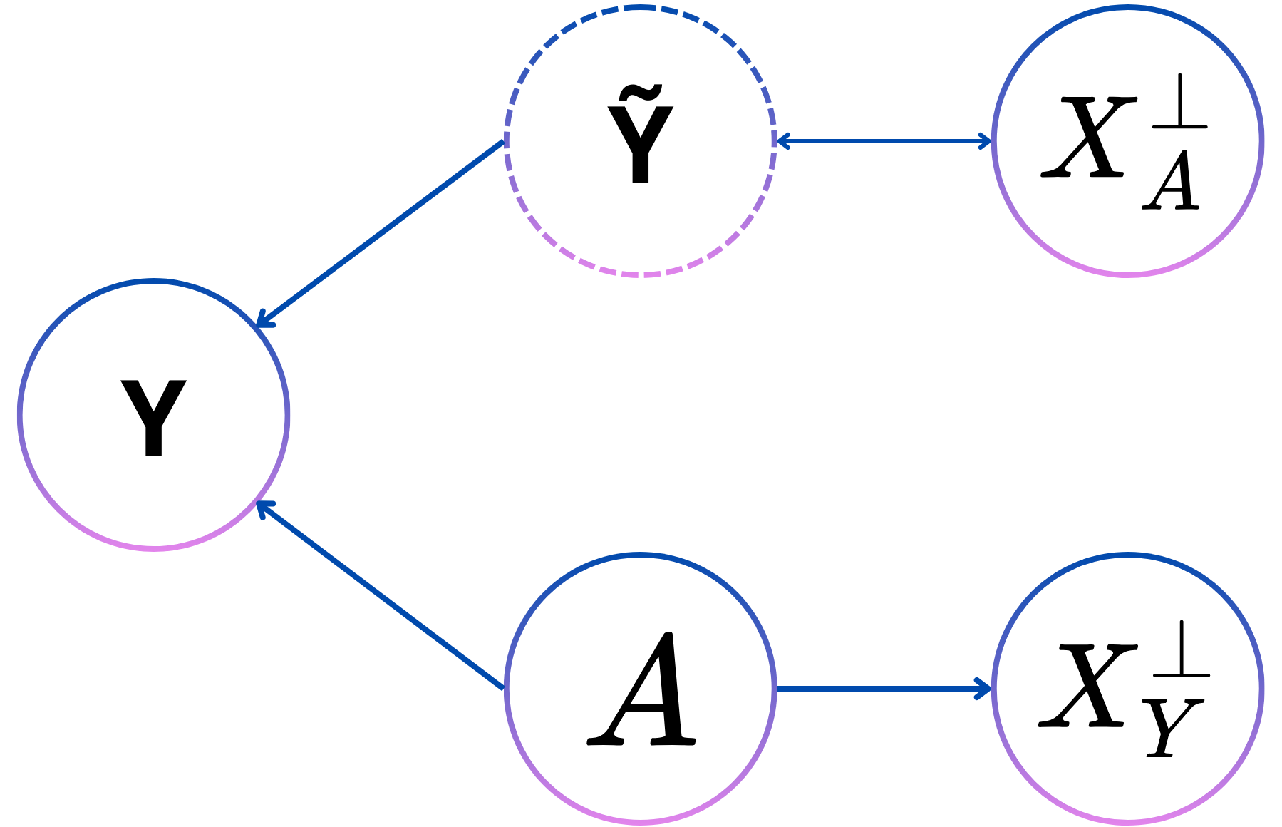 In the following section \(Y\) symbolises the perceived label, \(D\) the prediction, \(A\) the personal attributes, \(S\) the selection of a sample in the dataset, \(X^{\bot}_A\) the data independent of the personal attributes, \(X^{\bot}_Y\) the data independent of the prediction and \(\tilde{Y}\) the real label.