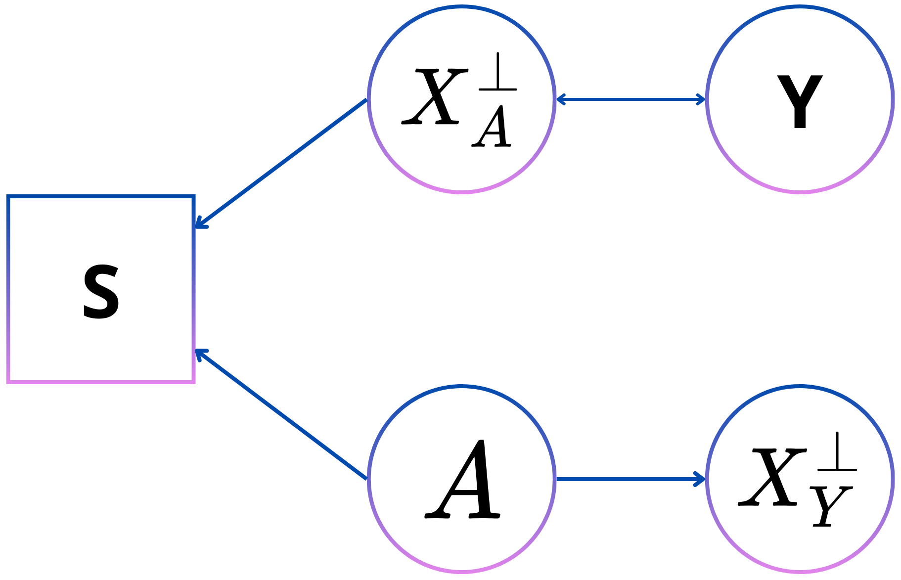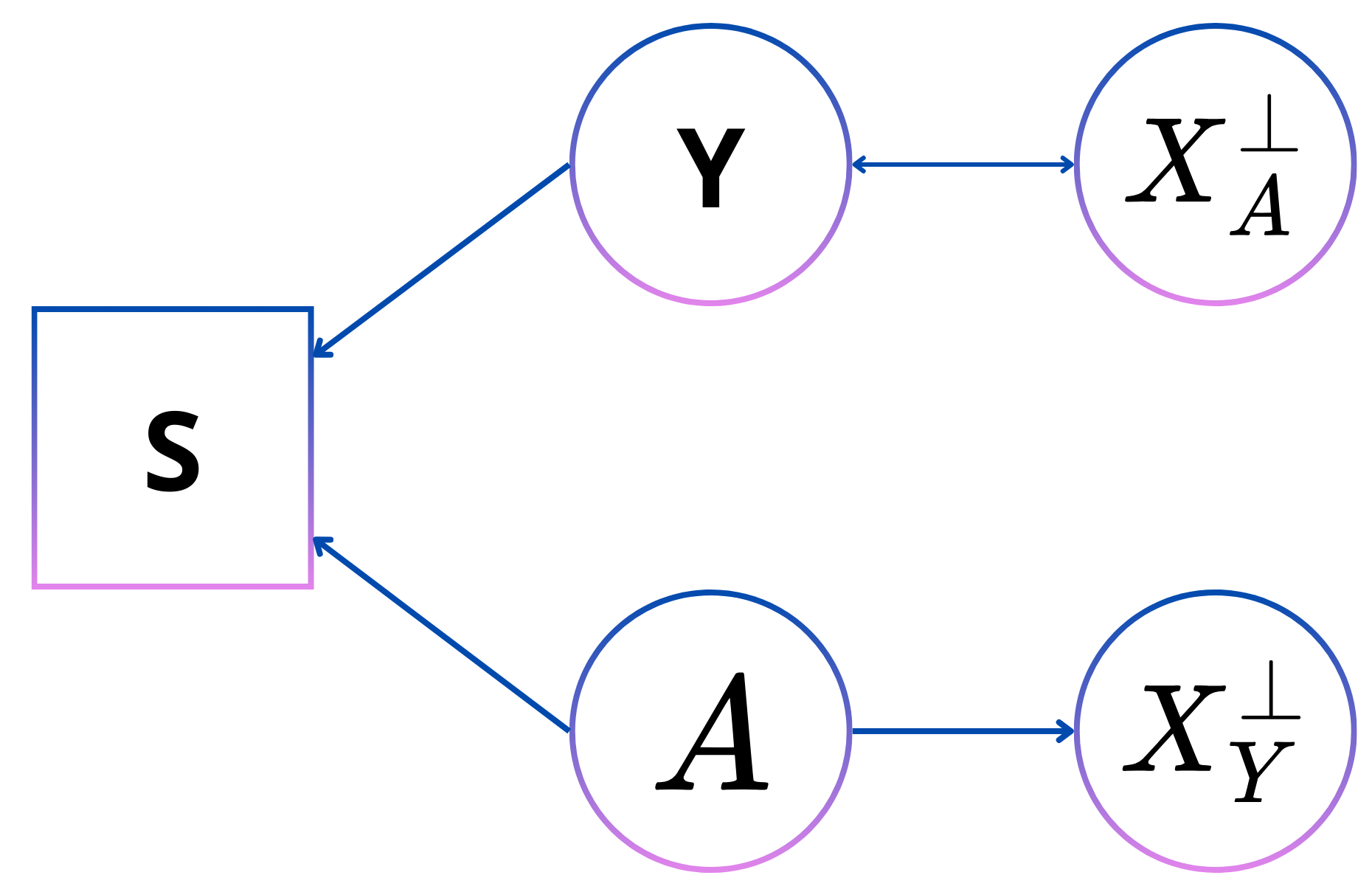 The directed acyclic graph in Figure 7 shows how to decouple the label itself with the personal attribute by introducing the variable of the selection bias in S, which is an observed variable. \(A\) and \(X^{\bot}_A\) are only connected through a path that includes \(Y\) which means that given \(Y\), \(A\) and \(X^{\bot}_A\) are independent, which is the condition of equalized odds.