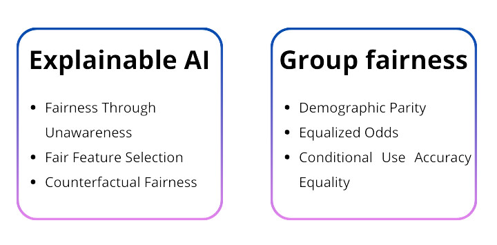 Two main philosophies can be found in research. The first one, often called explainable AI, aims to either create explainable models or to create explanations for the results obtained from a model. This can also be described as aiming for procedural fairness. The second philosophy is called group fairness. Group fairness focusses on outcome fairness. This means that the predictions from the AI system should have similar properties across groups that only differ in a certain personal attribute.