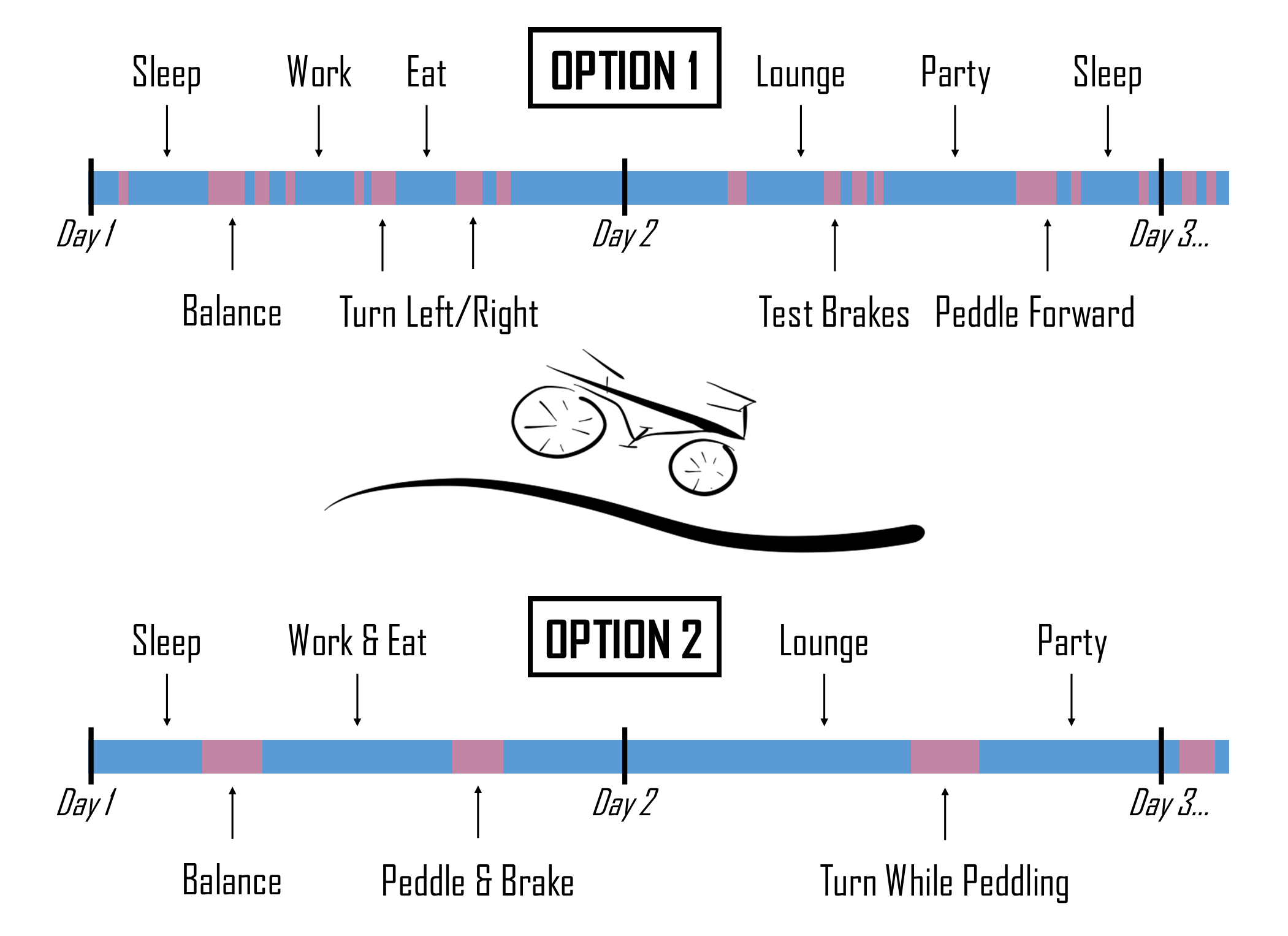 One frivolous strategy (Figure 1, Option 1) to overcome this dilemma is to interleave a few random actions on the bicycle throughout the remaining tasks of the day. This strategy neglects the sequential nature of bicycle riding and will achieve satisfaction very slowly, if at all. Furthermore, this strategy may interrupt and reduce the satisfaction of the other daily tasks. The more intuitive strategy (Figure 1, Option 2) is to dedicate significant portions of the day to explore the possible actions of bicycle riding. The benefits of this approach include testing the sequential relationships between actions, isolating different facets of the task for quick mastery, and providing an explicit cutoff point to shift focus and accomplish other daily tasks. Also – let’s face it – who wants to wake up in the middle of the night to turn the bicycle handlebar twice before going back to bed?