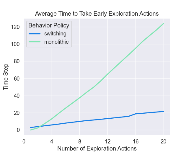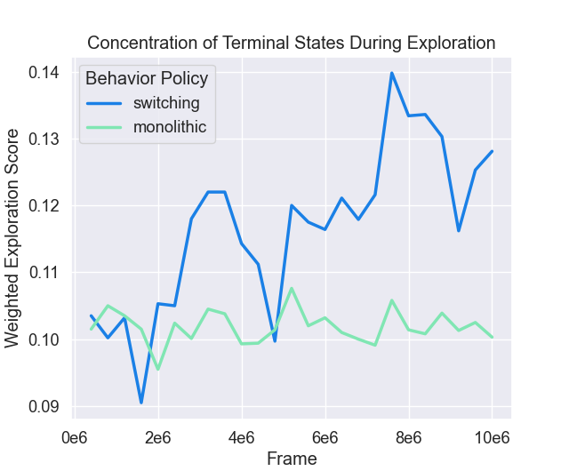 This blog post highlighted five observational differences between mode-switching and monolithic behavior policies on Atari and other illustrative tasks. The analysis showcased the flexibility of mode-switching policies, such as the ability to explore earlier in episodes and exploit at a notably higher rate. As the original study of mode-switching behavior by DeepMind was primarily concerned with performance, the experiments in this blog post supplement the study by providing a better understanding of the strengths and weaknesses of mode-switching exploration. Due to the vast challenges in RL, we envision that mode-switching policies will need to be tailored to specific environments to achieve the greatest performance gains over monolithic policies. Pending a wealth of future studies, we believe that mode-switching has the potential to become the default behavioral policy to be used by researchers and practitioners alike.