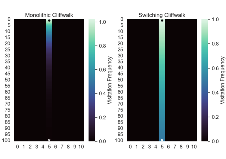 We showcase a quick illustrative example of the ability of switching policies to concentrate terminal states more uniformly in a cliffwalk environment (Figure 4). The agent starts at the black circle in the middle column and top row of a 101$\times$11 grid and attempts to reach the white ‘x’ at the bottom. All states aside from those in the middle column are terminal, and the heatmaps show the visitation frequency per episode of all non-terminal states across 10K episodes. When the exploitation policy is to move only downward and the behavior policies are the usual policies in these experiments, the agent incorporating a switching policy more heavily concentrates the terminal states in exploration mode and visits states further down the cliffwalk environment at a higher rate per episode.
