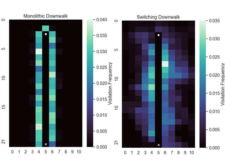We illustrate beginning exploration with a downwalk environment in which an agent attempts to first move to the middle column and then down the middle column to the white ‘x’ (Figure 6). The agent starts in the second row in the middle column at the white circle, and visitation frequencies across 1K episodes are shown for all states aside from those between the white circle and the white ‘x’, inclusive. We chose to analyze this environment because it is a crude approximation of the trajectory of agents that have learned a single policy and immediately move away from the initial start state at the beginning of an episode. The switching and monolithic policies are the same as before, and switching produces much higher visitation counts at states further from the obvious exploitation trajectory.