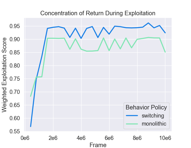We perform an experiment to determine the proportion of return that is concentrated during exploitation periods. Each reward during an episode is weighted by the proportion of exploitation actions during the past 10 time steps. The score for each episode is the sum of weighted rewards divided by the total rewards. Scores for each behavior policy and epoch are computed by averaging scores across all games. The results are shown in Figure 7. Quite quickly, exploitation steps of switching policies contain a greater percentage of the return than those of monolithic policies. This trend seems fairly constant after roughly 2M frames, with switching policies having roughly 95% of the return in exploitation steps and monolithic policies having roughly 90% of the return; from another point of view, exploration steps yield 5% of the return for switching policies and 10% of the return for monolithic policies. These results agree with Experiment 1, as switching policies will generally reach terminal states more frequently in explore mode and will not receive more rewards. Since most of the rewards in our selected Atari games are positive, switching policies should accrue lower return while in explore mode.