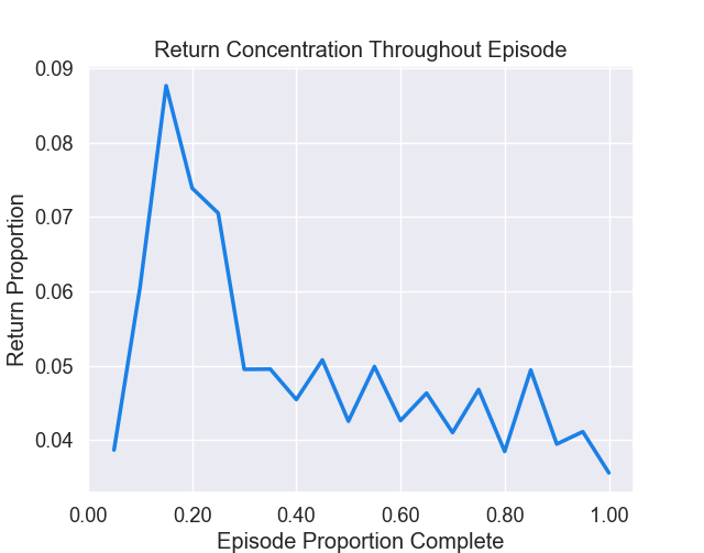 In Figure 8, we plot the proportion of episode return over the past 5% of the episode versus the current proportion of episode that is complete. Data is taken from the last training epoch. The results show that switching policies concentrate return more towards the beginning of each episode, most likely because its first exploit mode of switching policies is relatively long. Future work involves determining the extent to which the beginning exploitation mode of switching policies serves as a flexible alternative to resetting, which would have applications in situations that do not allow for manual resets such as model-free RL.