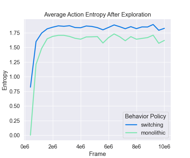 We quantify the diversity of the realized action distribution in the time step immediately after each exploration period. The diversity is quantified by entropy that has higher values for more random data and vice versa. An action distribution is constructed for each game and epoch, and the entropies across games are averaged. The results are shown in Figure 9. The entropy of the action distribution for switching policies is distinctly greater than that of monolithic policies. Like most of the previous results, this quantity only plateaus until roughly 2M frames have elapsed.