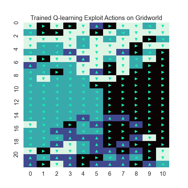 To illustrate this idea, we create a gridworld environment that provides the agent a reward of -1 for each time step that the agent is still on the grid; the agent’s goal is to leave the grid as quickly as possible. The agent begins in the center of the grid and learns through discrete Q-learning. Distinct actions have separate colors in Figure 10, with arrows showing the exploit action. The agent learns that it is fastest to exit the grid by going left or right. Notably, the actions near the top and bottom of the grid are seemingly random, as the agent has not seen and learned from those states as frequently as the others. Switching policies are more likely to reach the top and bottom areas of the gridworld state space and consequently would be more likely to have a higher entropy of the action distribution after exploration.