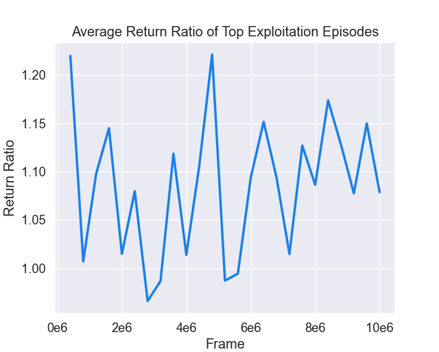 We perform an experiment to compare the return of the episodes with highest exploitation proportions between switching and monolithic policies. The returns of the top 10 of 100 episodes ranked by exploitation proportion of each epoch and game were averaged. Then, a ratio between the averages of switching and monolithic policies was computed and averaged across games. The results are plotted in Figure 11. There does not appear to be a clear trend aside from the ratio hovering mostly above 1.00, indicating that the top exploitation episodes of switching policies accrue more return than those of monolithic policies.