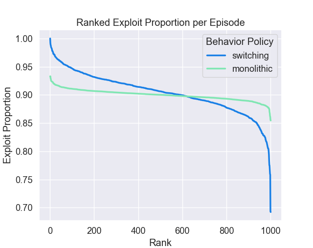 The results are best illustrated through plotting the switching and monolithic exploitation proportions for 1K episodes (10 games of the last epoch) as shown in Figure 12. The top 100 episodes with highest exploitation proportion take more exploitation actions than any monolithic episode. Therefore, the corresponding distribution is indeed more extreme.