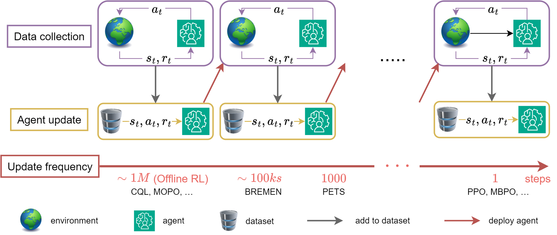 For the rest of this blog post, we define a deployment as a data collection campaign realized with a fixed agent. The agents are thus updated between two consecutive deployments but not within one deployment. The update frequency is the number of steps realized at each deployment (that we assume fixed for all deployments). We use the term agent to refer to all the components of the model-based algorithm that are used to act on the system. For instance, in a Dyna-style algorithm