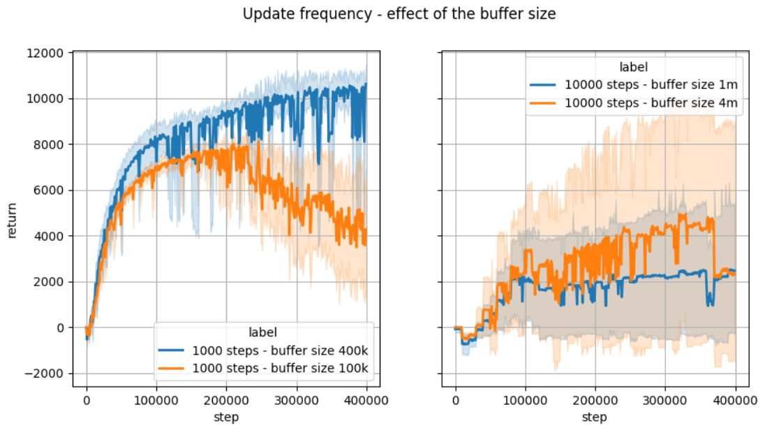 When trying these values of updates frequencies we adjusted the number of gradient steps to maintain a constant ratio of gradient steps per step on the real system. For the maximum buffer size of SAC we used the rule provided in MBPO’s code. The table below shows the values obtained for the maximum buffer size. As shown in the figure below, using a smaller buffer size negatively impacts the performance for the update frequency of 1000 steps and 10 000 steps. While there is a possibility that better values for the hyperparameters (other than the update frequency) could be found, we did what appeared to be the natural way to adapt the other hyperparameters when increasing the update frequency. See the Appendix for the complete description of the hyperparameters used in these experiments.