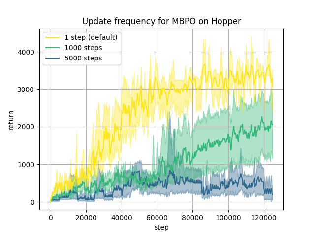 Coming back to the experiments run in MBPO’s paper, as the default MBPO implementation updates the model each 250 steps, it might also make sense to allow PETS to be updated each 250 steps as well to have comparable results. We also note that the MBRL-Lib paper