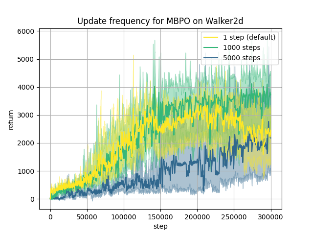 Except for the update frequency of 1000 steps on Halfcheetah and Walker which achieves similar performance than the default configuration updating the agent at each step, the results indicate a decline in asymptotic performance with larger update frequencies. Although MBPO exhibits good performance over different environments for the default update frequency, this is not the case for the other update frequencies that we consider here. We note here that 1000 steps is the usual maximum episode length and therefore a reasonable value to try for the update frequency. One insight from this experiment is that even though MBPO is one of the state-of-the-art MBRL algorithms, practical constraints like the update frequency can potentially alleviate its performance in real-world applications.