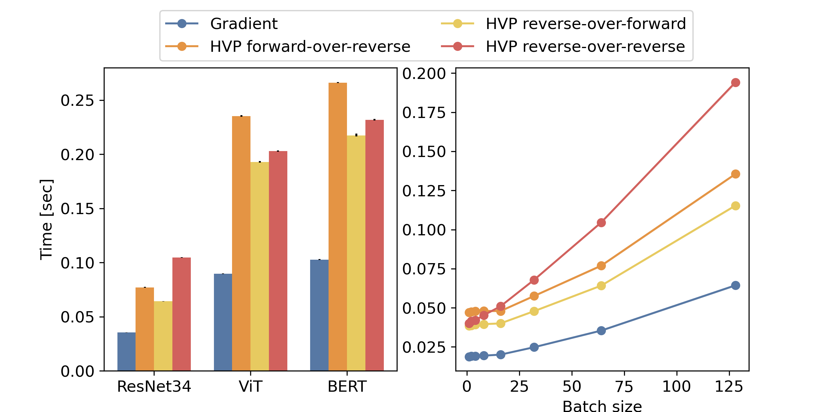 For ViT and BERT, the forward-over-reverse is surprisingly longer than the reverse-over-reverse method. Moreover, the scaling between the gradient and HVP computational time differs from the one we get with JAX. Indeed, for these architectures, the HVP computations take between four and five more time than the gradient computations. This is a discrepancy with what we would expect in theory. This might be because, at the time we are writing this blog post, the functional API of PyTorch is still in its early stages. Particularly, we could not use the compilation with torch.compile because it does not work with some operators of torch.func such as torch.func.jvp.