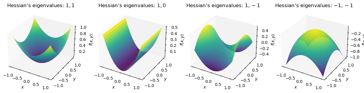 \[\nabla^2 f(\theta) = \left[\frac{\partial^2f}{\partial \theta_i\partial \theta_j}(\theta)\right]_{1\leq i,j\leq d}\in\mathbb{R}^{d\times d}\enspace.\]This matrix corresponds to the derivative of the gradient and captures how the gradient will change when moving \(x\). To evaluate the variation of the gradient when moving \(\theta\) in the direction \(v\in\mathbb{R}^d\), one can compute the quantity \(\nabla^2 f(\theta) v\in\mathbb{R}^d\). This is the Hessian-vector product (HVP).