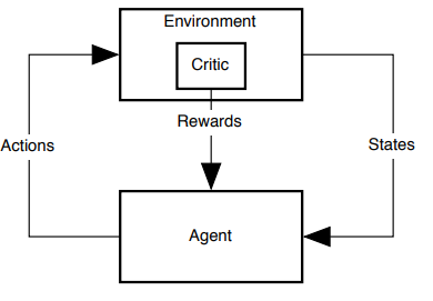 From the figure we can see that the agent observes a state and then takes action. The agent can then decide on its next action based on the next state it observes and the rewards it receives from the critic in the environment. The critic decides on what reward the agent receives at every time-step by evaluating its behaviour.