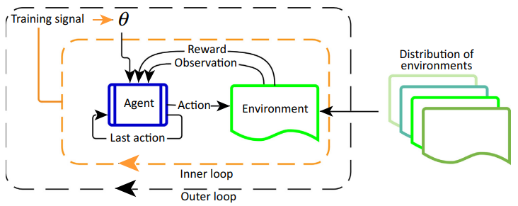 In basic RL, we have an algorithm \(f\) that outputs a policy, mapping states to actions. However, in meta-RL, our algorithm has meta-parameters \(\theta\) that outputs \(f\), and \(f\) then produces a policy when faced with a new MDP. Figure 4 illustrates that the meta-RL process. Note that in the outer loop the meta-parameters \(\theta\) are updated.