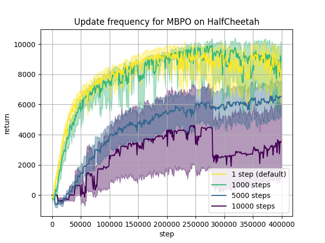 Coming back to the experiments run in MBPO’s paper, as the default MBPO implementation updates the model each 250 steps, it might also make sense to allow PETS to be updated each 250 steps as well to have comparable results. We also note that the MBRL-Lib paper