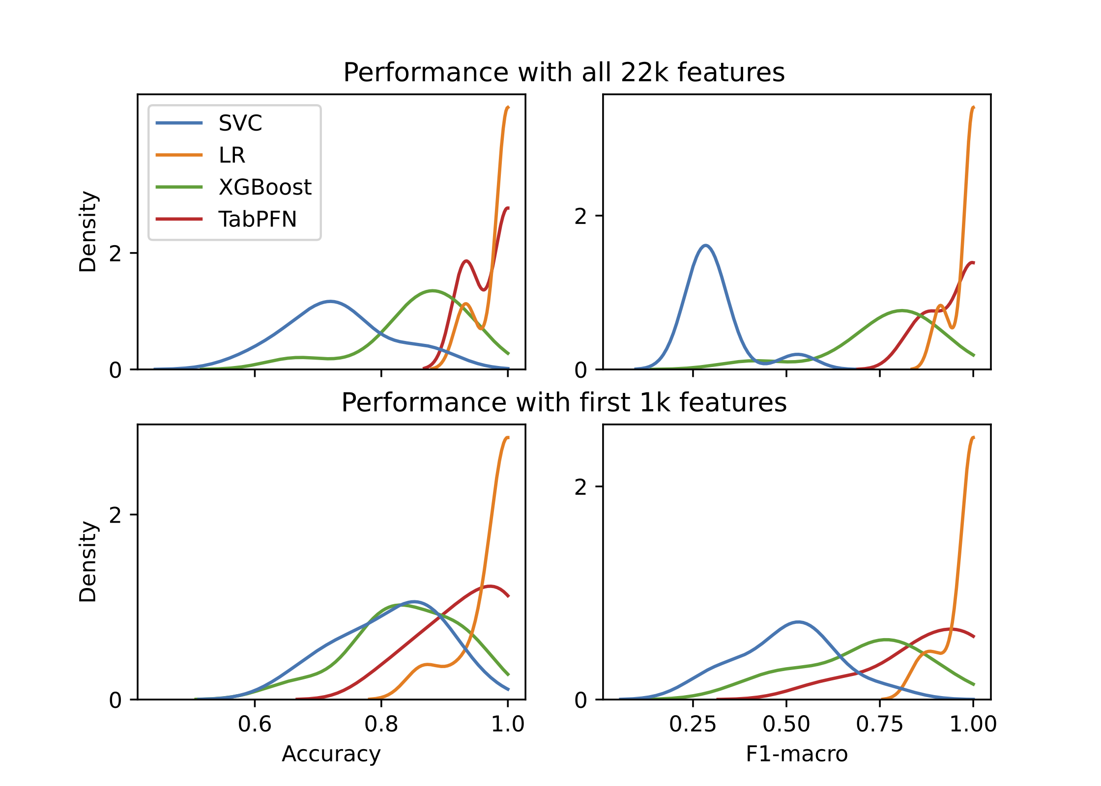Results are shown below, aggregated over 10 random 75-25 train-test splits, and evaluated via both accuracy and macro-averaged F1-score. TabPFN has a surprisingly strong showing, handily beating SVC and XGBoost, while almost matching logistic regression. This pattern holds both when we use all features and also when we use only the first 1k features.