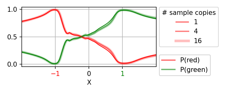 Meanwhile, there is no discernible effect from replicating samples, when both red and green samples are replicated. Below we show the predicted probabilities, when both red and green samples are each copied for a total of 1, 4, 16, and 64 times.