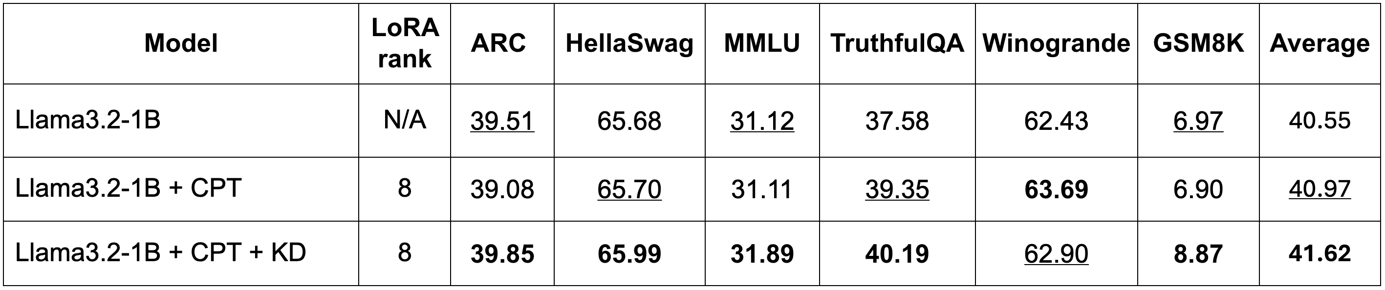 Compared to the baseline model Llama-3.2-1B, applying CPT alone reveals small performance changes in most benchmarks, with an average increase from 40.55 to 40.97. This improvement is primarily due to increases in TruthfulQA (from 37.58 to 39.35) and Winogrande (from 62.43 to 63.69), while the remaining benchmarks exhibit negligible or negative changes. In contrast, the model with both CPT and KD demonstrates a more substantial improvement over applying CPT alone. This is evident in the increased average score of 41.62, driven by improvements in MMLU, TruthfulQA, and particularly GSM8K, which increases from 6.90 to 8.87. These results suggest that combining CPT with KD yields more comprehensive performance improvements across multiple tasks.