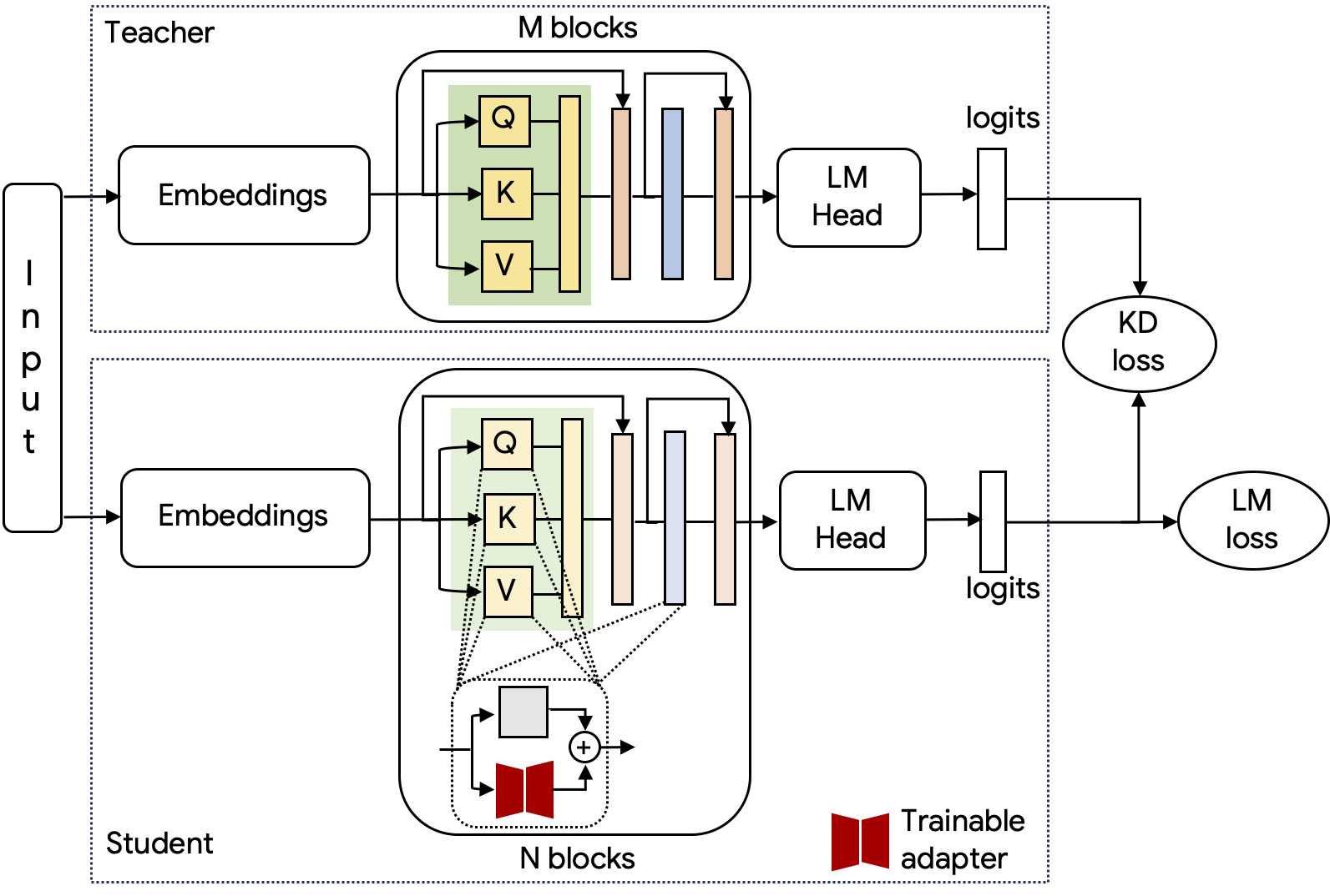 Knowledge distillation (KD): A larger, frozen pre-trained LLM is employed as the teacher model to facilitate knowledge distillation, transferring its knowledge to a smaller student model that consists of the frozen \(S\) augmented with trainable adapters \(A\). Specifically, the Kullback-Leibler divergence is used to measure the difference between the LM head logits of the teacher and student models, resulting in a corresponding knowledge distillation loss \(\mathcal{L}_{\text{KD}}\) during training, which guides the student to mimic the teacher’s output distributions.