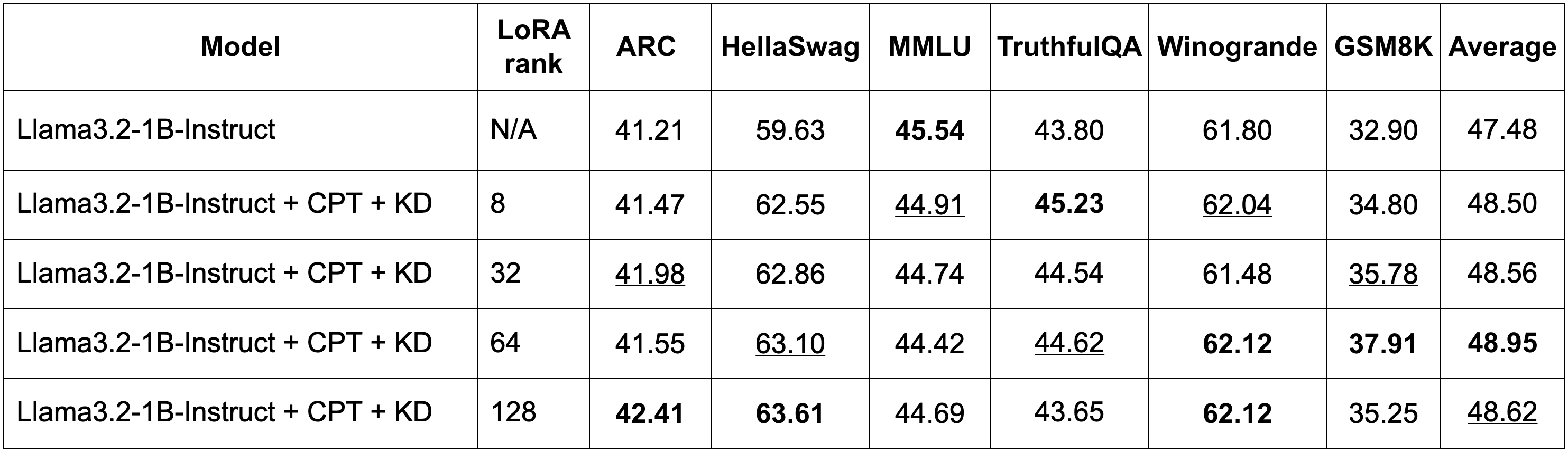 We study the effects of different LoRA ranks—8, 32, 64, and 128—using the student model Llama-3.2-1B-Instruct and the teacher model Llama-3.1-8B-Instruct, applying both CPT and KD. Table 2 shows the obtained results on the 6 key Open LLM benchmarks, revealing improvements of over 1.0 points across all ranks compared to the baseline Llama-3.2-1B-Instruct. The model with a LoRA rank of 64 stands out as the best performer, achieving an average score of 48.95 and excelling in the GSM8K benchmark with a score of 37.91. Notably, the overall average scores—48.50, 48.56, 48.95, and 48.62 for ranks 8, 32, 64, and 128, respectively—show minimal variation, indicating that changes in LoRA rank have little impact on performance differences. Benchmarks such as ARC and Winogrande also exhibit only slight fluctuations, while small improvements in GSM8K from rank 8 to 64 are not significant enough to indicate a clear advantage for any particular rank.