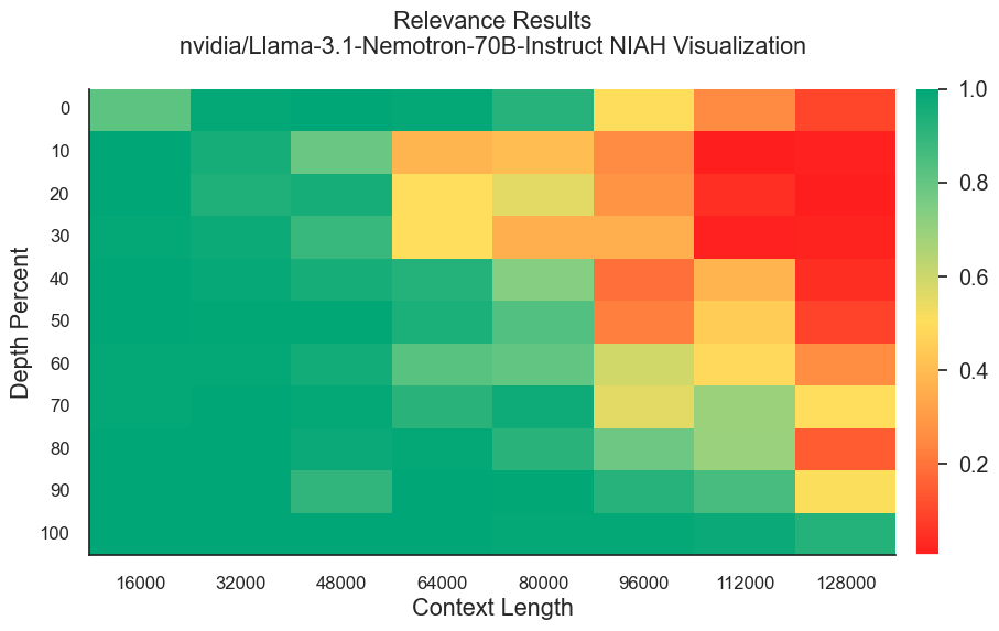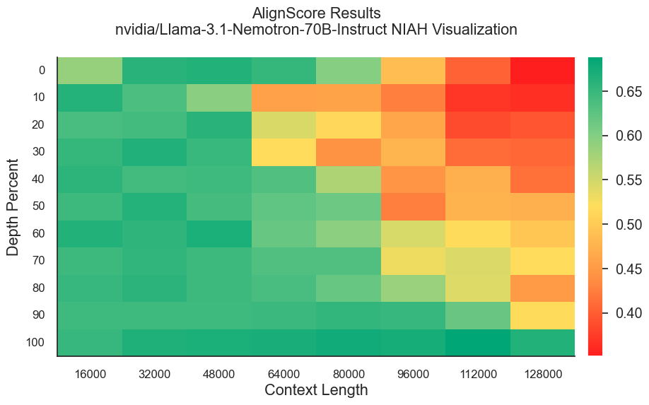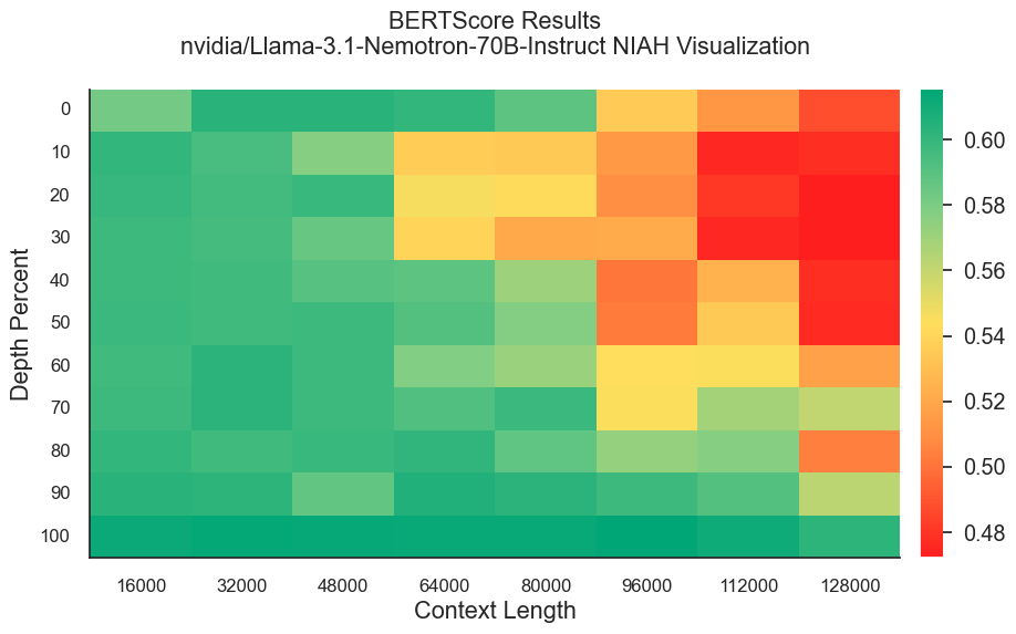 In this blog post, we evaluate the Llama 3.1 70B Nemotron Instruct model using the chapter summarization version of the NIAH test. Our results show that the 70B model still needs to improve context utilization, as performance deteriorates quickly once the context length exceeds 64k tokens. We also observe a “lost in the beginning” pattern in terms of document depth, where the model performs particularly poorly when key information is placed in the initial parts of the context, specifically at depths between 10-30% for long context lengths. Comparing to GPT-4o-mini, we find that the 70B model still has a significant gap to close in terms of accurately identifying key information in the context.