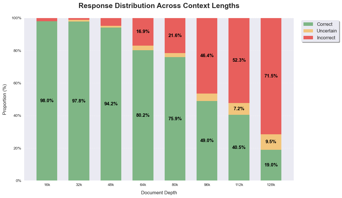 To gain a better understanding of the performance differences across various context lengths, we examine the proportions of irrelevant, partially relevant, and fully relevant summaries at different context lengths. From Figure 3, we can see that the model maintains robust performance (>94% correct responses) up to 48k tokens, suggesting strong capability in handling moderate-length contexts. However, this performance begins to decline abruptly as the context length increases, with notable drops around 48k-64k tokens where relevant cases decrease rapidly. The decline becomes particularly pronounced after 96k tokens, where correct responses drop below 50%, ultimately reaching just 19% at 128k tokens. This pattern, coupled with the corresponding exponential rise in incorrect responses at longer context lengths, indicates a systematic degradation in the model’s ability to identify key information as the context length increases.