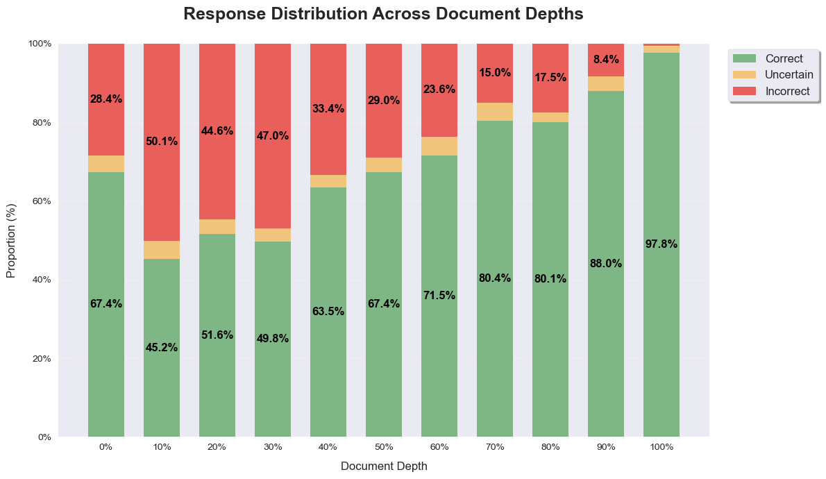 Conducting the same analysis on document depth, we observe that the distribution is more uniform compared to the distribution of context length. The model is able to generate over 60% of relevant summaries at all depths except for the 10%-30% range. We also observe an steady increase in performance towards deeper depths starting from 30%, where the proportion of fully relevant summaries climbs from 49.8% at 30% depth to 97.8% at 100% depth. Interestingly, the model has a 28.4% error rate at the beginning of the document, which is smaller than the error rates at depths of 10%-50%, but larger than those at the remaining depths. This distribution can be explained by the “lost in the beginning” pattern observed in Figure 1, but also resembles a “lost in the middle” pattern skewed toward the beginning of the document. Finally, the proportion of partially relevant summaries is evenly distributed across all depths (<5%), in contrast to the distribution over context length in Figure 3, where the majority of partially relevant summaries are found at high context lengths. This balanced distribution of uncertain responses suggests that the model maintains consistent calibration regardless of document depth, avoiding confusion between irrelevant context and key information.