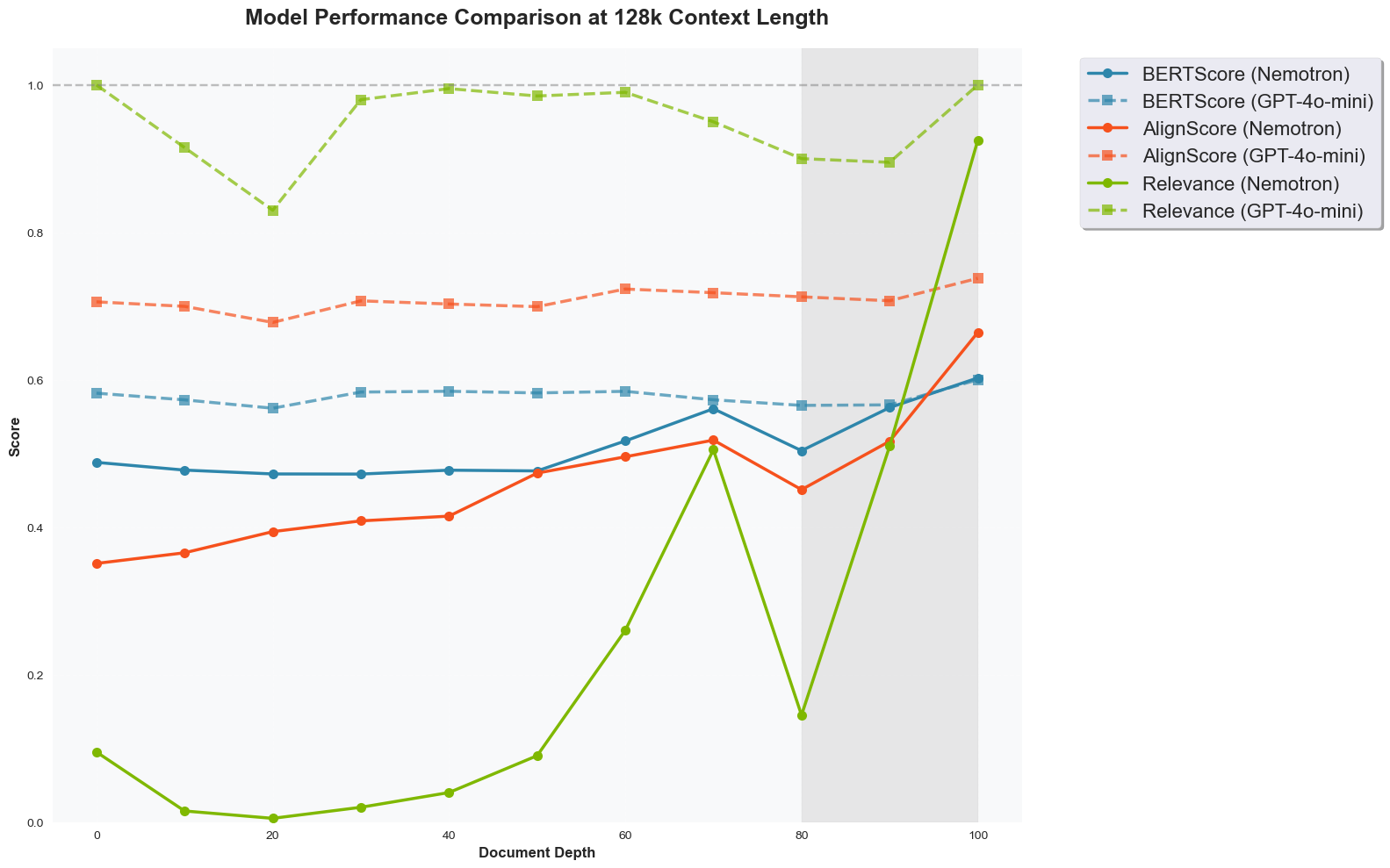 All analysis up to this point has been based on the nvidia/Llama-3.1-Nemotron-70B-Instruct model only. To understand how it compares to the most capable closed-source models, we run the full 128k context length test on the GPT-4o-mini model to see if any performance gap exists. Figure 5 shows the comparison between the two models across all metrics. We can immediately observe that the 70B model experiences a drastic drop in relevance scores. While GPT-4o-mini achieves near perfect relevance scores at several depths, the 70B model is only able to match the performance at the end of the context. Although the GPT-4o-mini model shows a similar pattern to the the 70B model, with performance at 10-30% depths lagging behind other depths, it still maintains a relevance score above 0.8, while the 70B model drops to nearly 0 at the same depths. The curve of GPT-4o-mini is also more stable compared to the 70B model, where the latter oscillates wildly starting from the 60% depth onward.